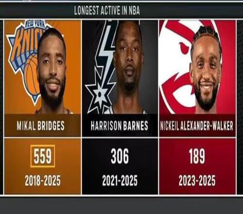 第三节直播画面当中,提到了现役球员连续出勤纪录,尼克斯球员布里奇斯连续出战559场断层领先其他球员。