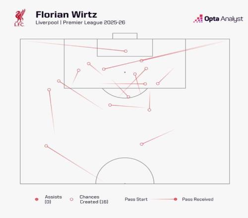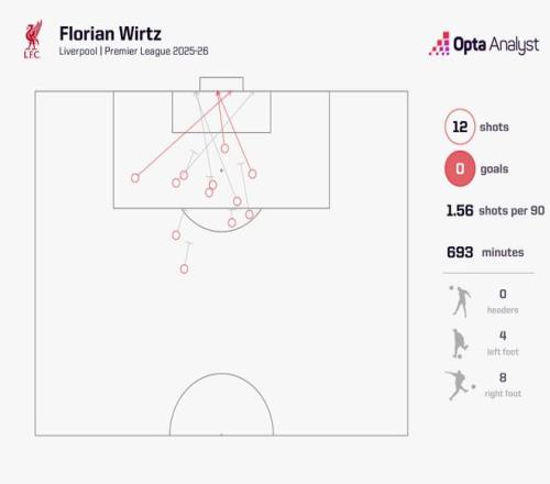 考虑各项赛事,维尔茨已经为利物浦出场16次,未斩获进球,有3次助攻入账。
