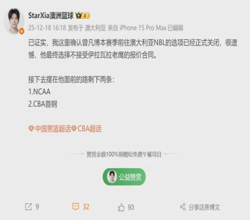 北京时间12月18日下午,据澳洲当地篮球记者报道,中国球员曾凡博拒绝接受伊拉瓦拉老鹰的报价合同,他本赛季前往澳大利亚NBL联赛的大门正式关闭。目前摆在曾凡博面前只有两条路:1、像林葳一样征战NCAA;2、重返CBA北京首钢。